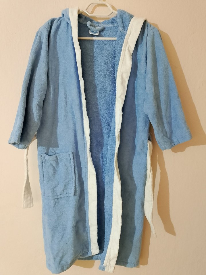 Erkek çocuklar için pastel mavi renkli, hafif tie-dye desenli bornoz. Kapüşonlu, ön cep ve bağlamalı. Yumuşak ve rahat kumaşla konfor sağlar. 11-12 yaş için uygundur
