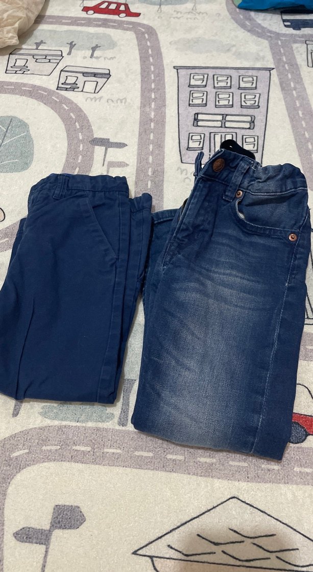 Erkek çocuklar için parlak bağlamalı desenli, fermuarlı mavi denim pantolon, sokak stili için uygundur. 2 adettir, Lacivert HM markasına ait ve 2/3 yaş diğerini bilmiyorum, 3/4 yaş olması gerekiyor