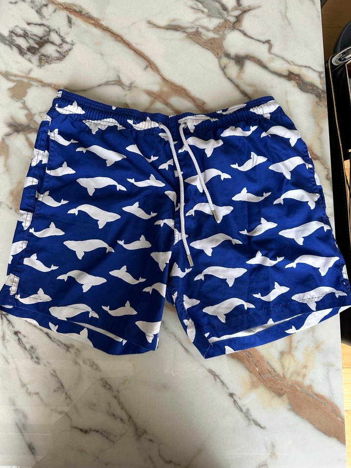 Koyu mavi renkte, beyaz balina desenli ve ayarlanabilir bel bantlı erkek çocuk deniz şortu.