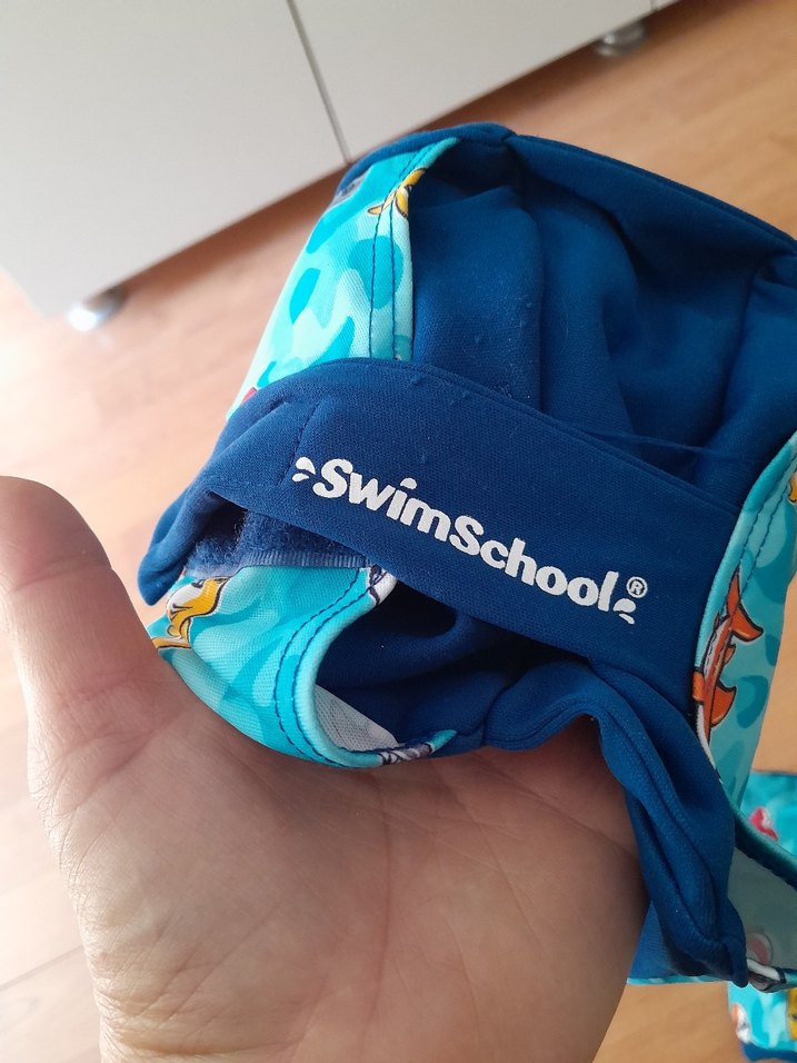 Parlak mavi baskılı kumaştan, askılı tasarımlı erkek çocuk mayo, SwimSchool marka logosu ile.