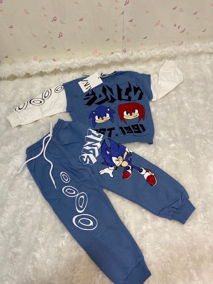 Rahat kesim erkek çocuk mavi denim eşofman takımı, renkli baskılar ve kürk detaylıdır. Üstü bisiklet yaka ve "T.19" baskılıdır.