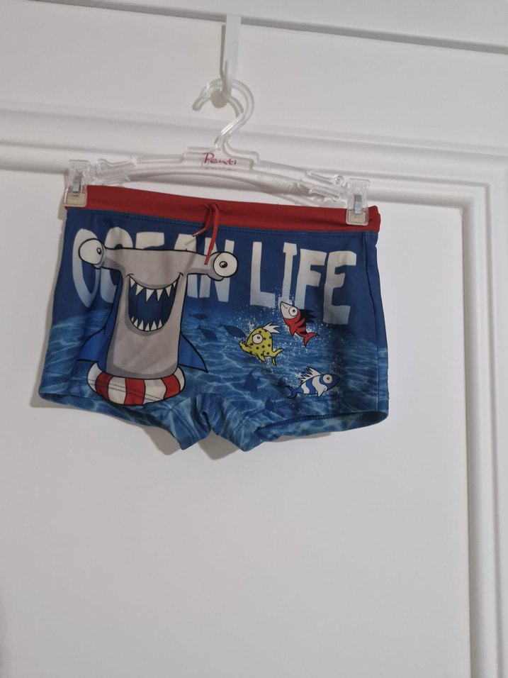 Mavi renkli, renkli baskılı deniz canlıları ve köpekbalığı desenli erkek çocuk deniz şortu. Kırmızı bel bandı ve "LIFE" yazısı bulunur.