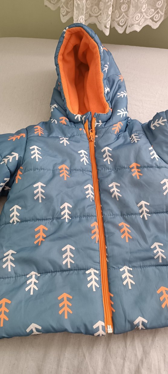Fermuarlı ve yakası kesimli, yumuşak iç astarlı, mavi ve gri baskılı erkek çocuk montu. Trendy ve rahat bir tarz sunar. birkaç kez kullanıldı temiz çok güzel bir mont