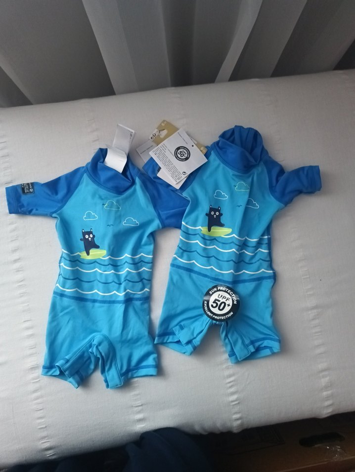 Renkli mavi, kısa kollu erkek çocuk mayo, üzerinde baskılı oyuncu ayı deseni ve UPF 50+ güneş koruması sağlar. 6 aylık ikiz bebekler için uygundur iki adet fiyatıdır