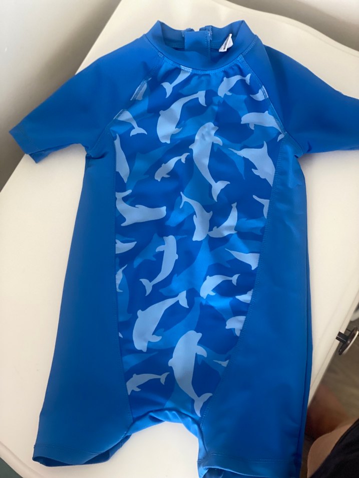 Kısa kollu, koyu mavi renkli erkek çocuk mayosu, yunus baskılıdır ve önünde fermuar bulunur.