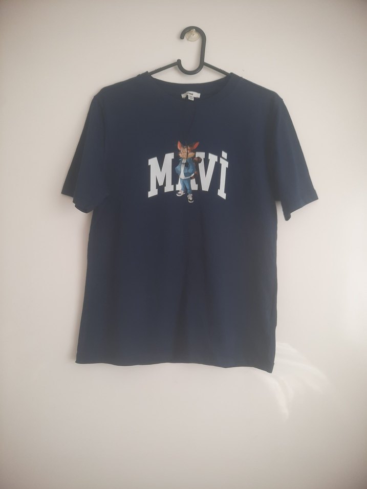 Erkek çocuklar için gevşek kesim, kısa kollu ve bisiklet yaka tişört. Kot görünümlü kumaştan, koyu mavi renkte ve önünde baskılı desen bulunur.