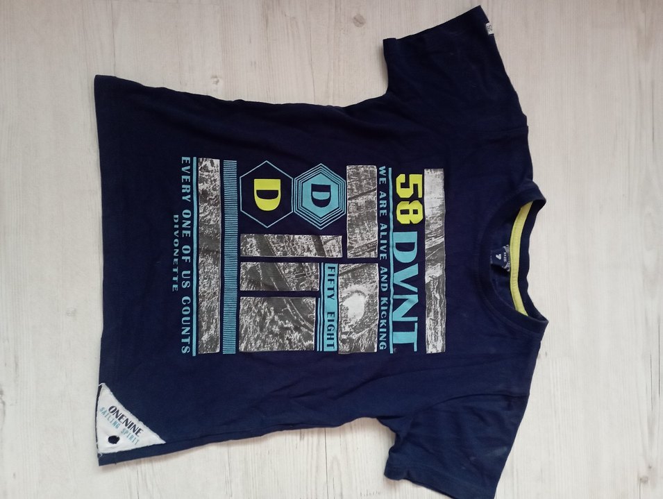 Erkek çocuklar için mavi denim kumaştan, baskılı desenli, kısa kollu, salaş kesim ve bisiklet yaka tişört. Sokak tarzına uygun rahat bir modeldir.