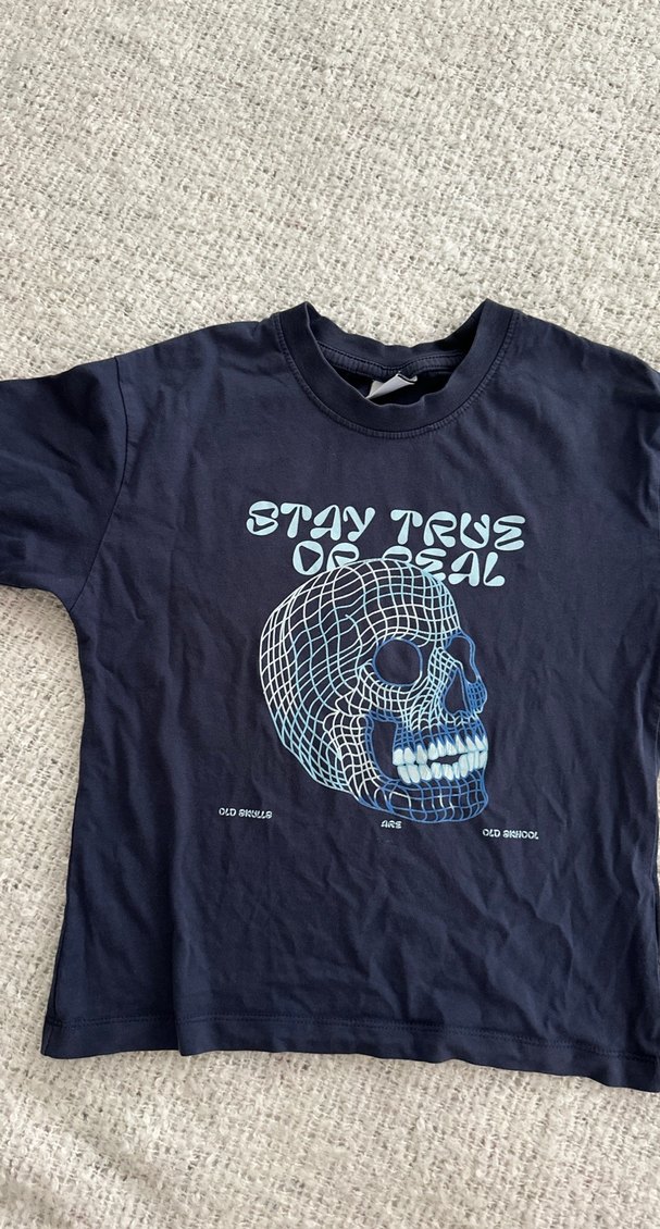 Erkek çocuklar için bol kesim, kısa kollu ve bisiklet yaka tişört. Denim kumaştan, mavi renkli baskılı kafatası ve "STAY TRUE" yazısı bulunur. 6-7 yaş.