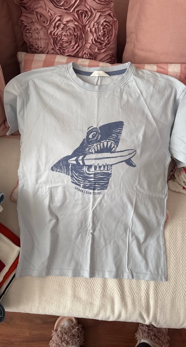 Erkek çocuklar için mavi renkli, pamuklu, kısa kollu ve bol kesim tişört. Önünde baskılı köpekbalığı deseni bulunur.