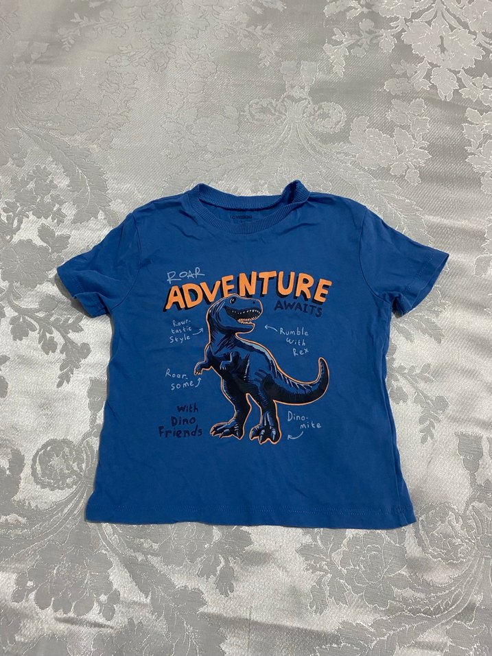 Fitted kesim, yuvarlak yakalı erkek çocuk tişörtü, kısa kollu ve koyu mavi renkte. Önü dinozor baskılı ve 'ADVENTURE' yazılı. Sentetik kumaştan, tokalı detaylı.