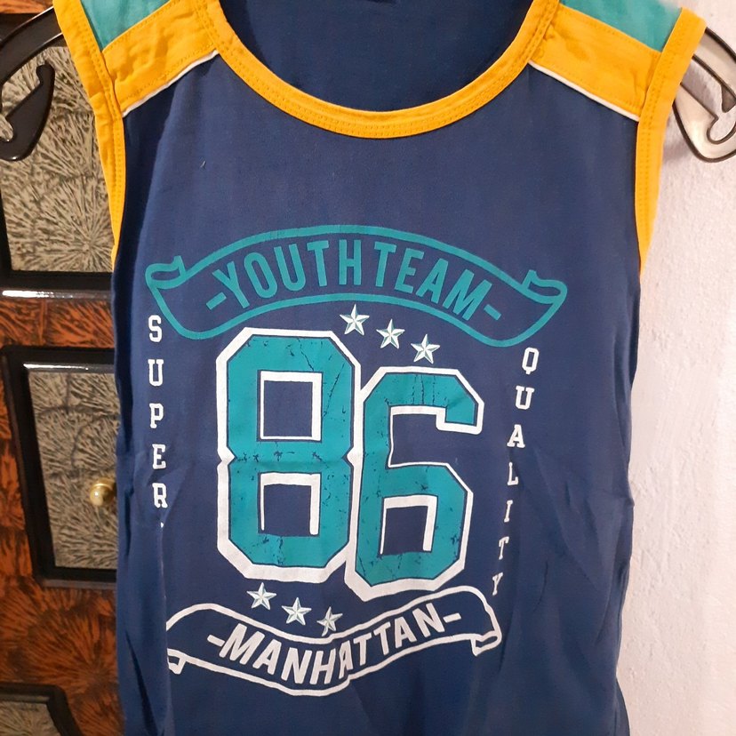 Kolsuz, mavi renkli erkek çocuk tişörtü, baskılı ve zincir detaylıdır. Dar kesim, yuvarlak yaka ve sentetik yumuşak kumaştan üretilmiştir. 86 numara baskılıdır. 9 10 yaş arası çocuklar için uygundur