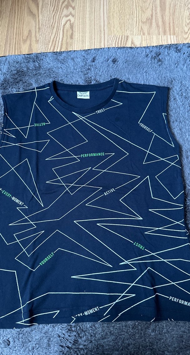 Mavi, kolsuz ve yuvarlak yakalı, bol kesim triko yelek. Üzerinde "PERFORM" yazılı geometrik baskılar bulunur. Yumuşak sentetik kumaştan üretilmiştir.