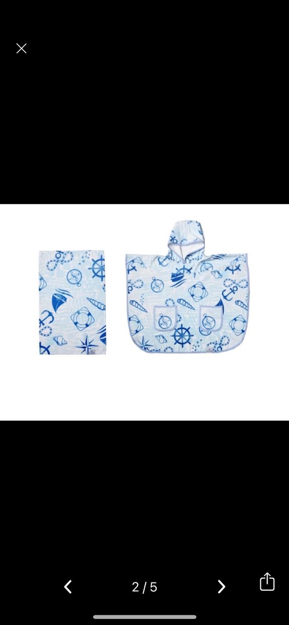 Erkek çocuklar için mavi ve gri tonlarda baskılı deniz temalı panço ve havlu seti, az kullanıldı
