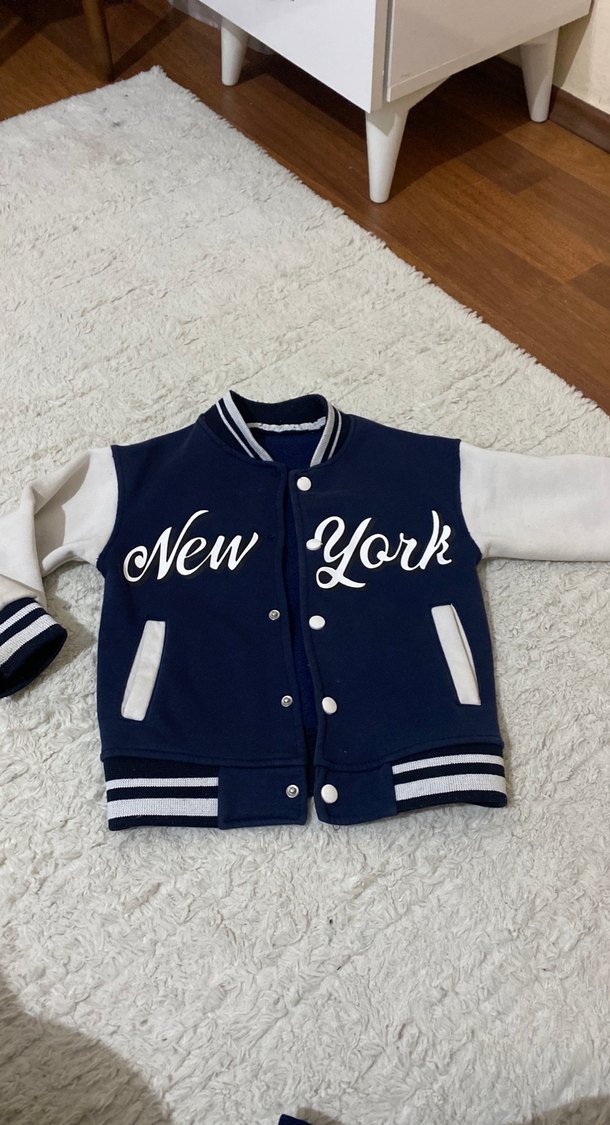 Yukarda 2 döğmesi düşmüş Erkek çocuk mavi renkli, baskılı streetwear ceket. Beyaz kollar ve cepler, bol kesim ve yuvarlak yaka. Yumuşak, kürk detaylı kumaş içerir.
