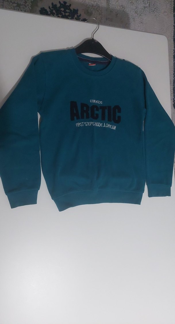 Koyu mavi renkli, bisiklet yaka ve uzun kollu çocuk sweatshirtü. Yumuşak tüylü kumaştan, bol kesim ve örme dokulu, önünde ARCTIC baskılı.