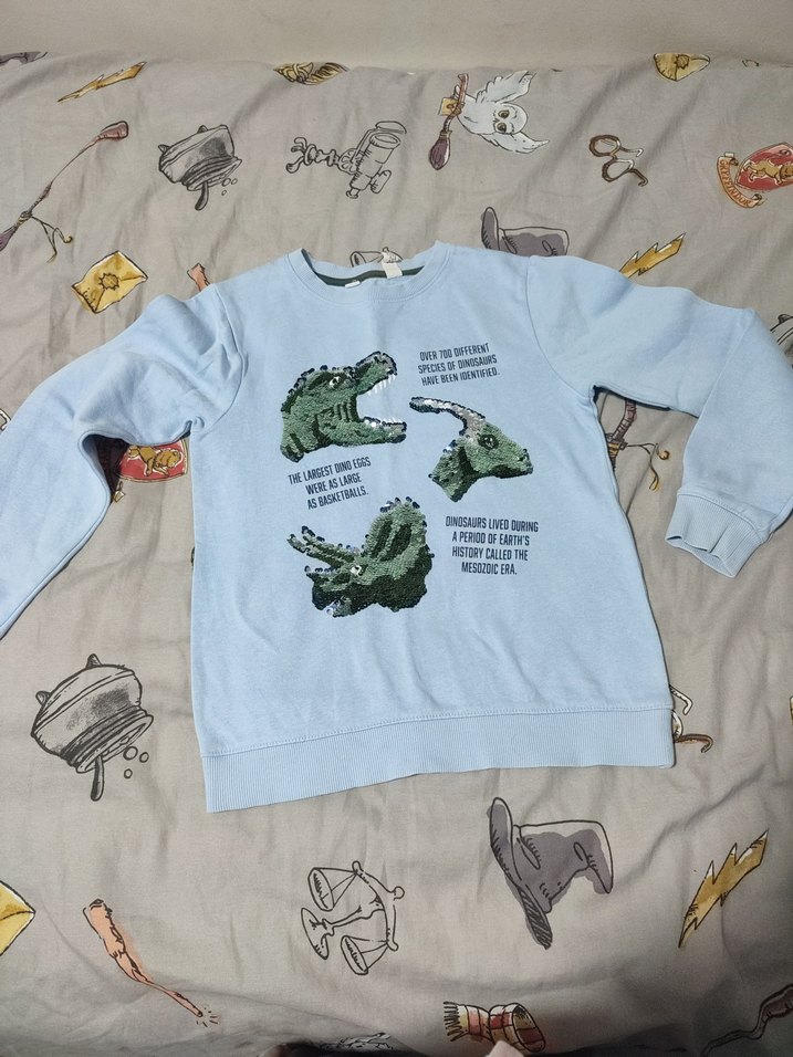 Erkek çocuk için, uzun kollu ve yuvarlak yaka, bol kesim mavi sweatshirt. Yumuşak ve örgü dokulu fleece kumaştan, baskılı dinozor desenli.