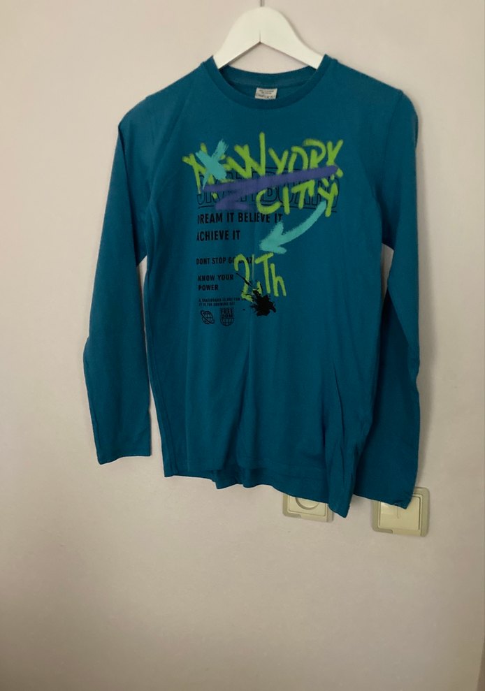 Erkek çocuk için uzun kollu, bol kesim ve yuvarlak yaka sweatshirt. Yumuşak, sıcak kumaştan üretilmiş, koyu mavi renkte ve baskılı tasarıma sahip. 12,14 yaş