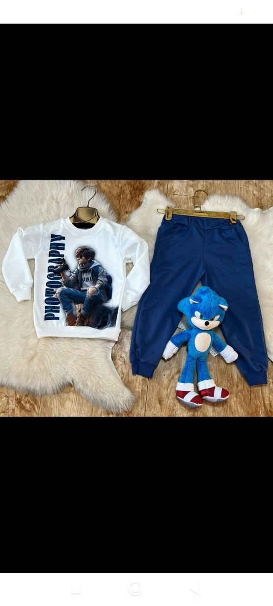 Erkek çocuklar için bol kesim, baskılı beyaz sweatshirt ve koyu mavi eşofman takımı. Kürk detaylı, rahat ve trend sokak stili.