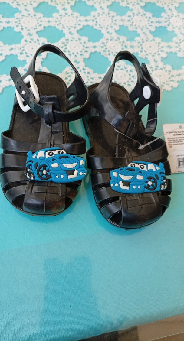 Koyu mavi renkli, tokalı bantlara sahip, baskılı araba desenli erkek çocuk terliği, kauçuk malzemeden üretilmiştir.