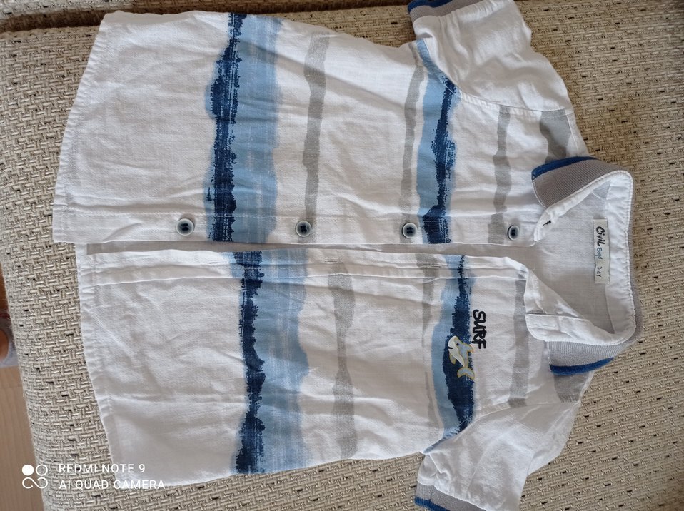 Erkek çocuklar için kısa kollu, yakalı ve bol kesim gömlek. Mavi ve gri batik desenli, düğmeli ve üzerinde 'SURF' yazısı bulunan rahat bir model.