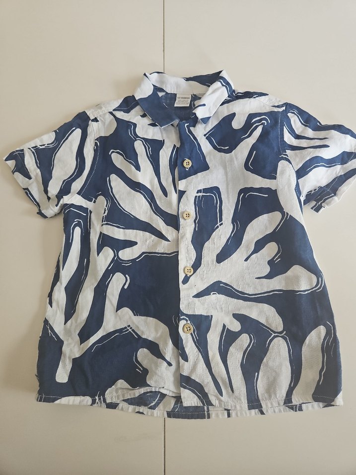 Erkek çocuklar için keten kumaştan yapılmış, bol kesim, yakalı ve kısa kollu mavi batik desenli, düğmeli gömlek. cok az kullanildi
