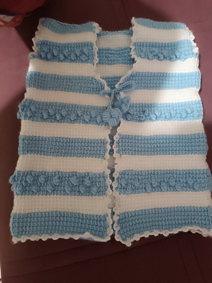 erkek çocukları için mavi ve beyaz çizgili, örgüden yapılmış, kolsuz ve kayık yaka yelek. Rahat kesimli ve klasik tarzdadır.