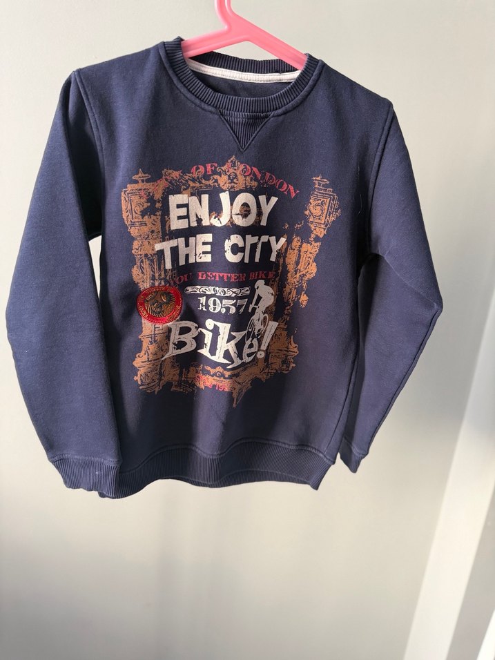 Erkek çocuk için mavi, bisiklet baskılı sweatshirt. Yuvarlak yaka, uzun kollu, bol kesim ve yumuşak kumaştan yapılmıştır. Fermuar detaylıdır. ️