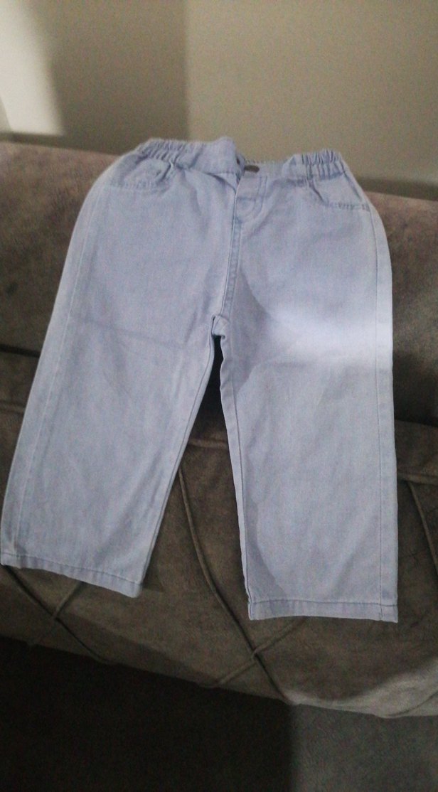 Erkek çocuklar için düğmeli, bol kesim gri denim pantolon. Günlük kullanıma uygun sade ve rahat tarz.