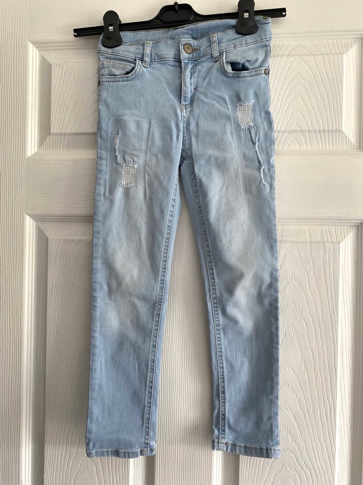 Erkek çocuklar için bol kesim, tokalı denim pantolon. Açık mavi renkte, yıpratma detaylarıyla trend sokak stili sunar.
