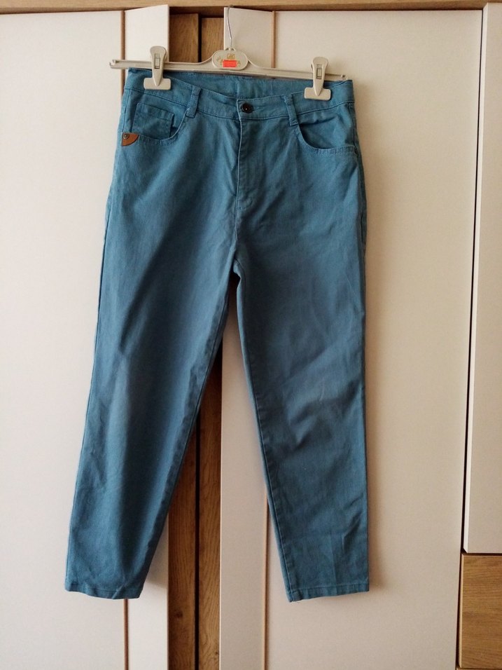Mavi kot kumaştan, bol kesim erkek çocuk pantolonu, kemerli ve desensizdir. Trendy casual stil için uygundur.