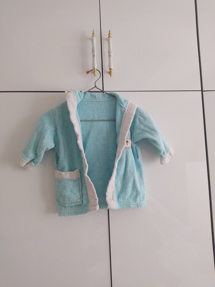 Yumuşak ve rahat pastel mavi erkek çocuk bornozu, beyaz şerit ve ön cepli. Banyo sonrası için uygun.