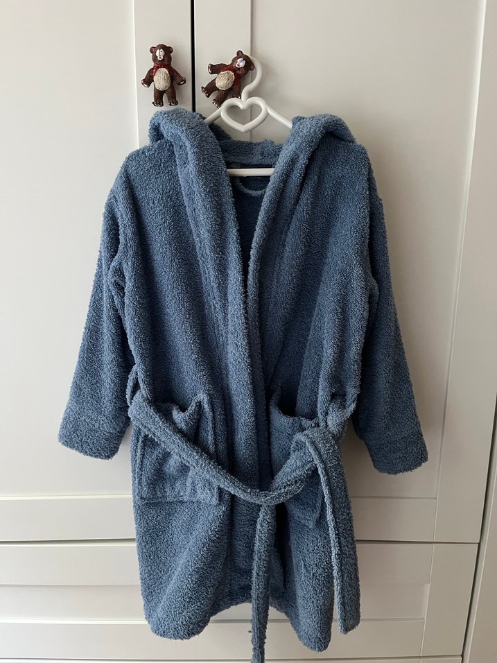 Bella Maison Kapüşonlu ve kemerli, yumuşak ve sıcak mavi erkek çocuk bornozu. Banyo sonrası veya evde rahat kullanım için uygun. 3-4 yaş