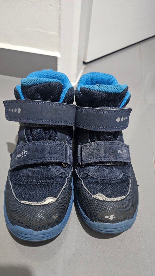 Koyu mavi, cırt cırtlı ve kauçuk tabanlı erkek çocuk botu, sokak stiline uygun rahat tasarım. superfit 32