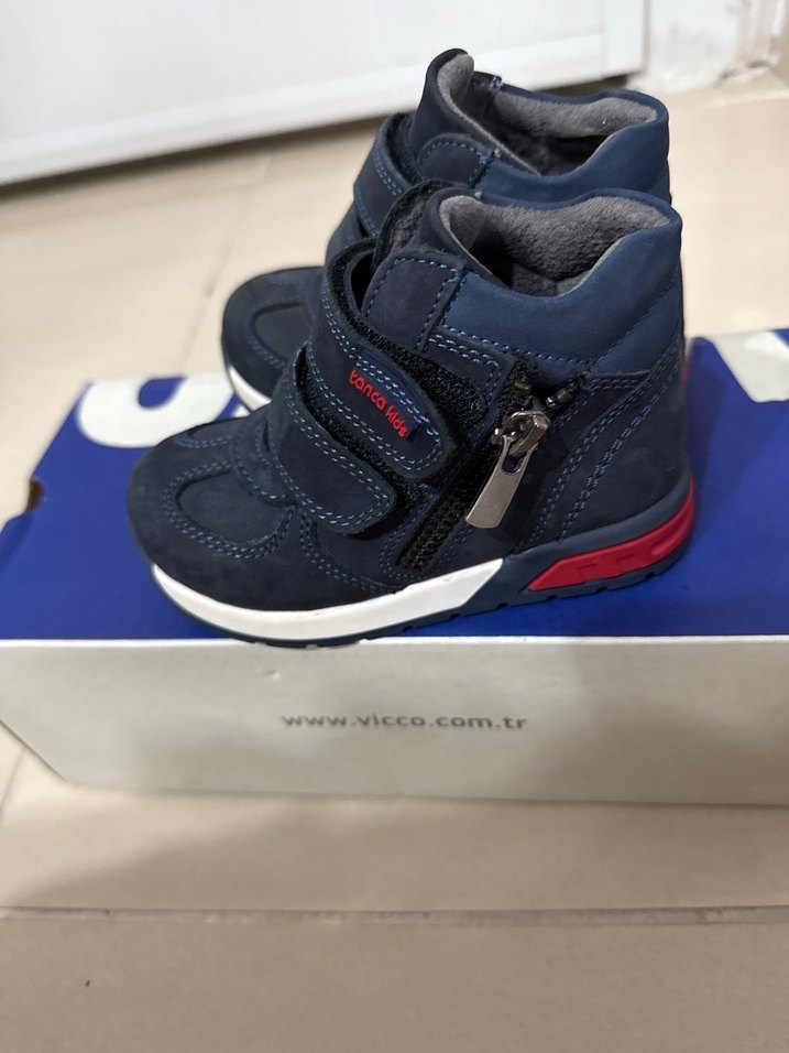 Lastik malzemeden yapılmış, mavi renkli, cırt cırtlı ve fermuarlı erkek çocuk botu, sokak stiline uygun desenli tasarım.