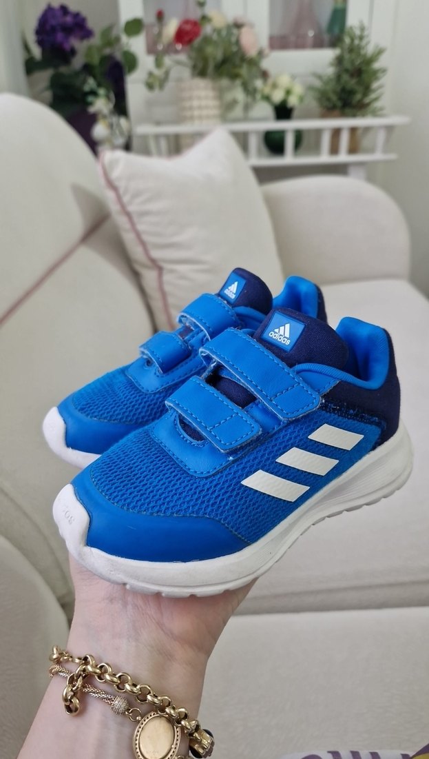 Mavi renk, cırt cırtlı, lastik tabanlı, baskılı desenli erkek çocuk spor ayakkabısı. Trendy rahat sokak stili için uygun.