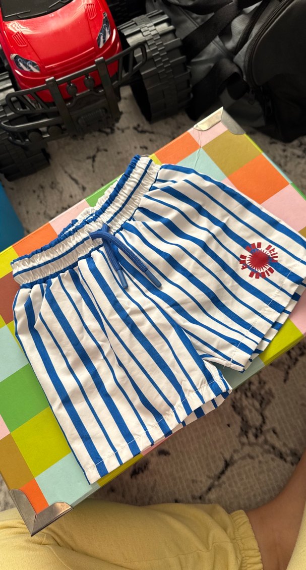Erkek çocuklar için elastik bel ve bağcıklı mavi çizgili deniz şortu, küçük kırmızı güneş baskılı.