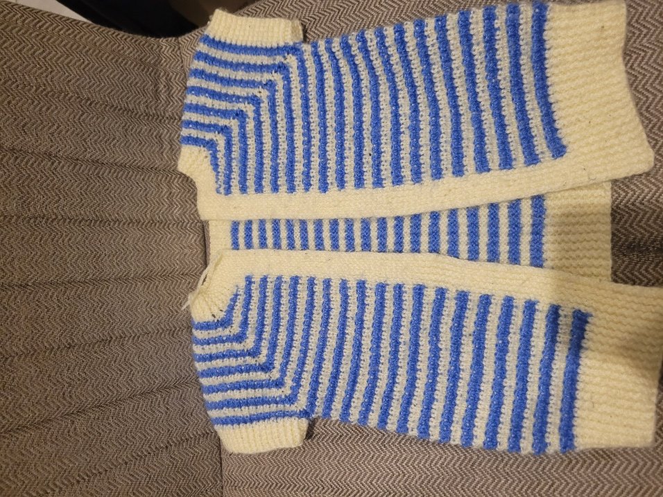 Erkek bebekler için mavi ve beyaz çizgili, örgü, bohem tarzda, rahat örgü yelek. 1 yaşa uygundur. Sadece birkaç kez kullanıldı. Yeni denilebilir.
