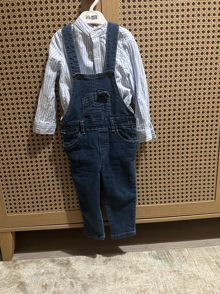 Mavi denim askılı tulum, ayarlanabilir tokalı askılarla ve mavi çizgili uzun kollu gömlekle kombinlenmiştir. Regular fit ve rahat bir tarza sahiptir. Hiç bir kusuru yoktur