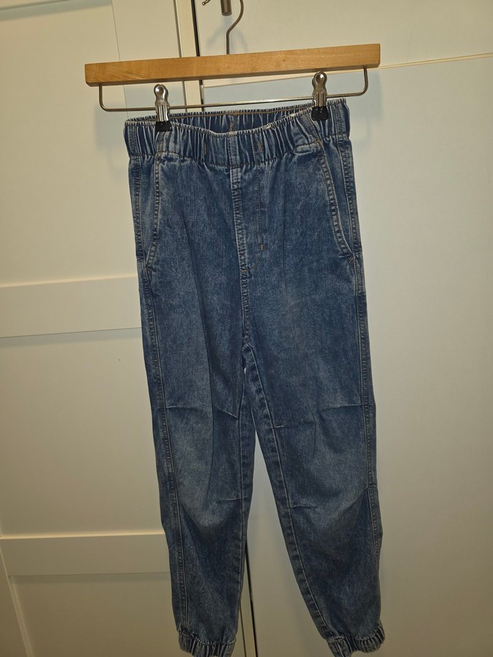 erkek çocuk için bol kesim, kemerli, normal midi boyda denim pantolon. Desensiz mavi-gri renk, günlük sokak stiline uygundur. paçası lastikli