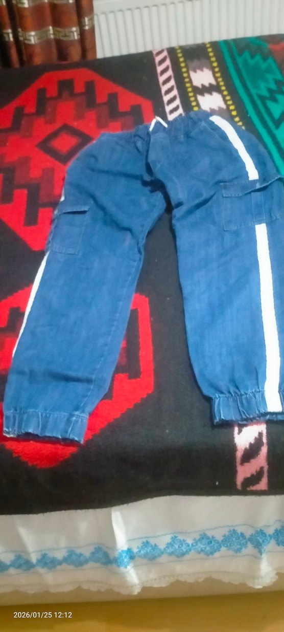 Beyaz yan şerit detaylı, kemerli bel ve bol kesim mavi denim erkek çocuk pantolon. Rahat ve şık, sokak modasına uygun.