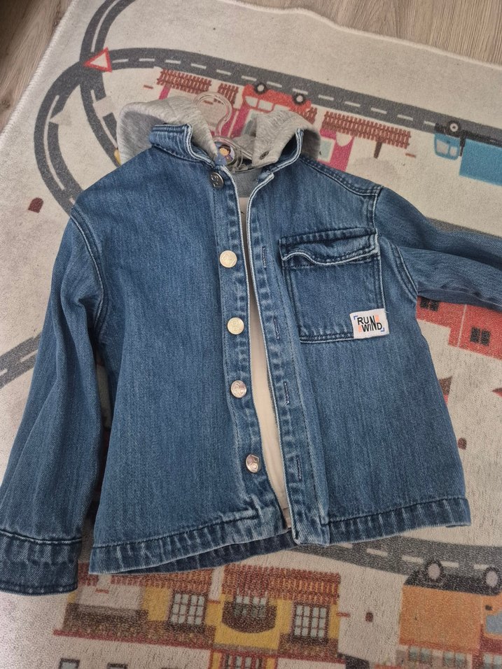 Erkek çocuklar için loose fit mavi denim ceket, düğmeli ve notched lapel yaka detaylıdır. Ön cepte küçük etiket ve gri kapüşon baskılıdır.