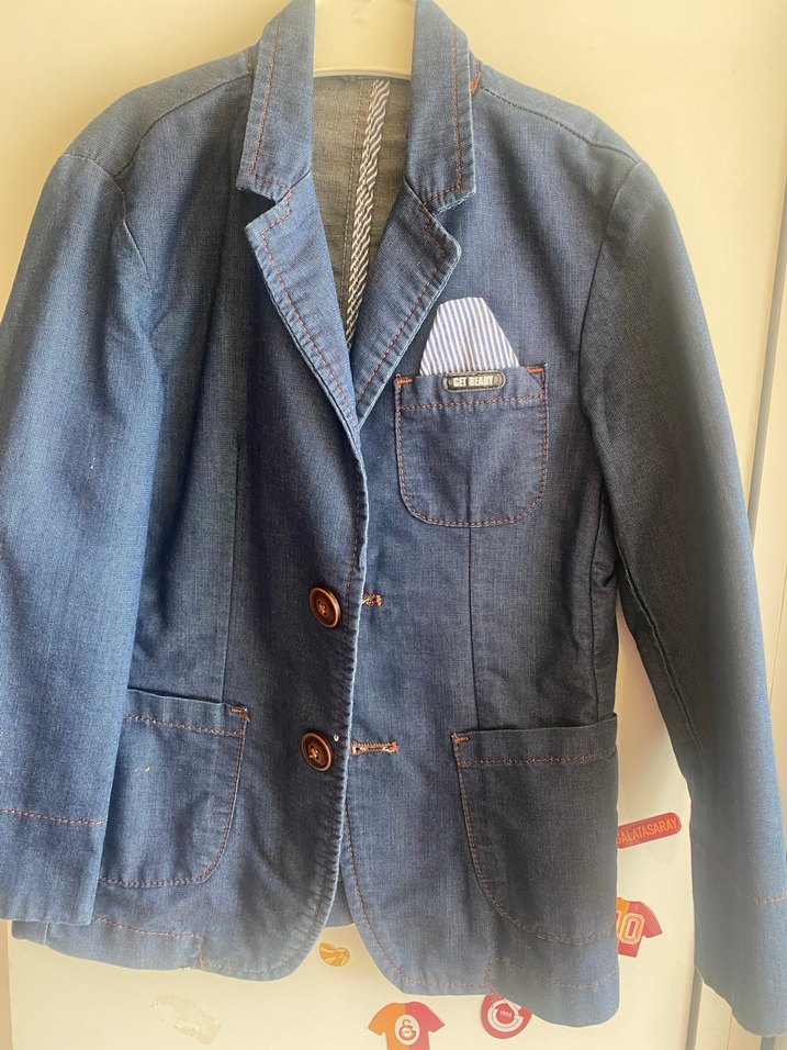 Erkek çocuklar için mavi denim ceket, kesik yaka ve düğmeli kapama ile. Üç cepli, regular fit ve desen içermeyen rahat bir dış giyim ürünü.