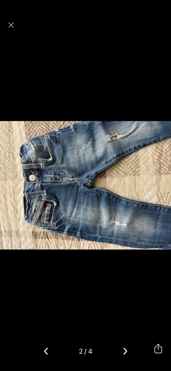 Erkek çocuk için dar kesim mavi denim pantolon, tokalı bel ve hafif yıpranmış detaylara sahip, trend sokak stili için uygun.