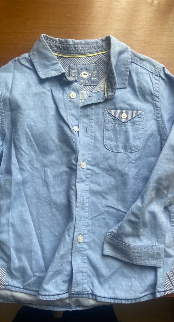 Erkek çocuklar için düğmeli, uzun kollu, yakası kesik denim gömlek. Yumuşak kumaştan, regular fit ve ince puantiyeli desene sahip. Trendy casual tarz için uygun.