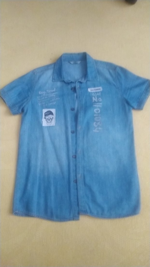 Erkek çocuklar için loose fit, kısa kollu ve yakalı mavi pastel denim gömlek. Düğmeli ve baskılı street wear tarzında tasarlanmıştır.