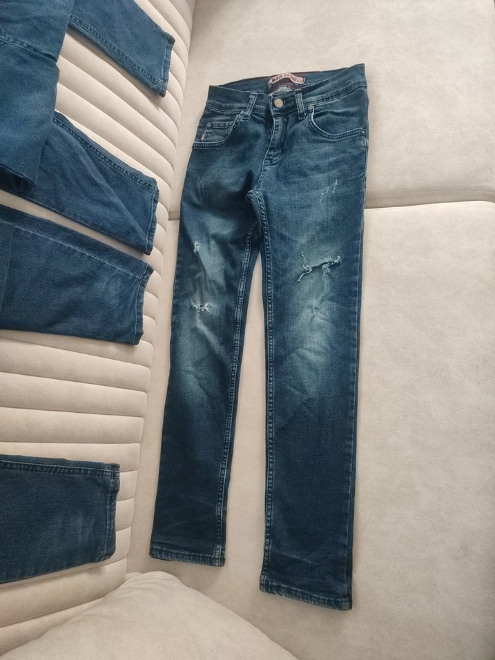9-10 yaş için regular fit, normal boyda gri-mavi tonlarında denim pantolon. Sokak tarzı için uygun, tokalı ve hafif yırtık detaylıdır. Günlük kullanıma uygundur. 4 tane erkek çocuk pantolon 3'ü çok iyi durumda 1'inin dizinde hafif deforme var . dizine amblem yapıştırışabilir fazladan koydum