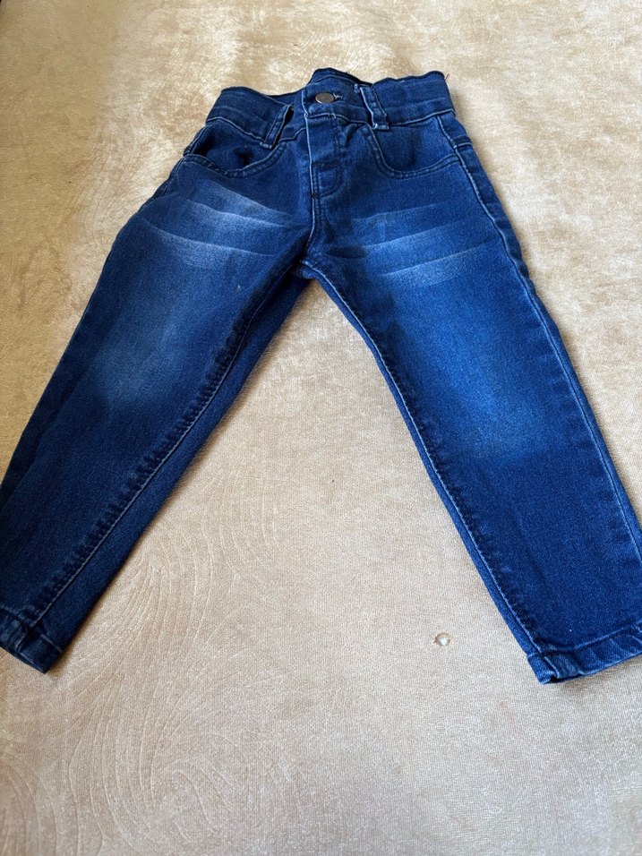 Erkek çocuklar için mavi denim pantolon, regular fit ve düğmeli. Parlak kumaşı günlük normcore tarzına uygun.