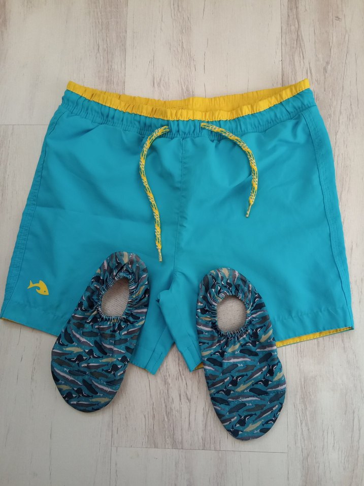 Erkek çocuklar için sarı bel bantlı mavi deniz şortu ve renkli balık desenli su ayakkabıları seti. Belden bağlamalıdır. (sol ayakkabınin uç kısmında biraz incelme var)