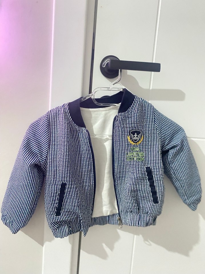 erkek çocuk ceketi, klasik yakalı ve rahat kesimdir. Mavi ve gri tonlarda, yumuşak ve sıcak kumaştan üretilmiştir.