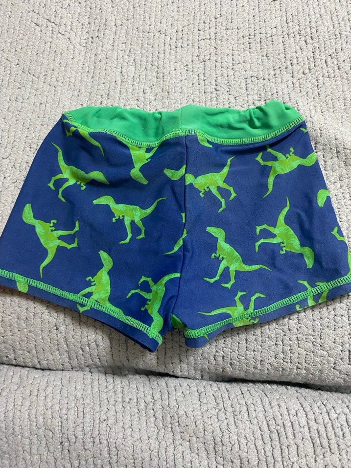 Erkek çocuklar için yeşil dinazor desenli, yeşil bel bantlı mavi mayo şortu.